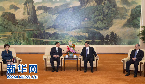 25日上午,中共中央總書記習近平在人民大會堂會見中國國民黨榮譽主席連戰及隨訪的台灣各界人士時強調,繼續推動兩岸關系和平發展、促進兩岸和平統一,是新一屆中共中央領導集體的責任。(記者 李寒芳)