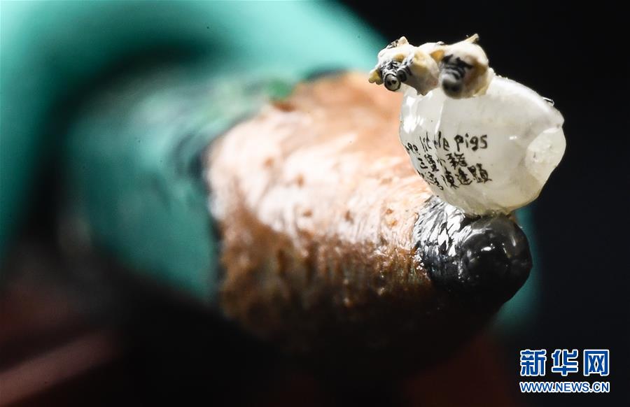 微雕作品“三隻小豬”中的每隻小豬長寬高均約1毫米,它們並排“站”在一顆在鉛筆尖大小的米粒上(1月24日攝)。 近日,台灣微雕藝術家陳逢顯歷時3個多月,在樹脂材料上雕刻完成3隻栩栩如生的“袖珍豬”,以此迎接農歷豬年的到來。 新華社記者 李響攝