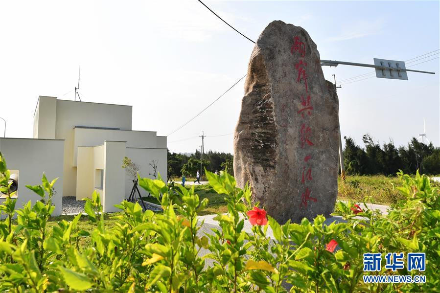 在田埔水庫不遠處,立著一塊大石頭,上面刻寫著一行醒目的紅色字句“兩岸共飲一江水”(9月16日攝)。新華社記者 陳斌 攝