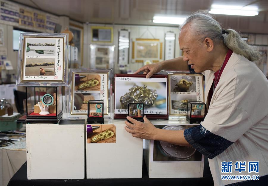 1月7日,台灣毫芒雕刻家陳逢顯在新北市工作室裡整理創作的微雕作品。