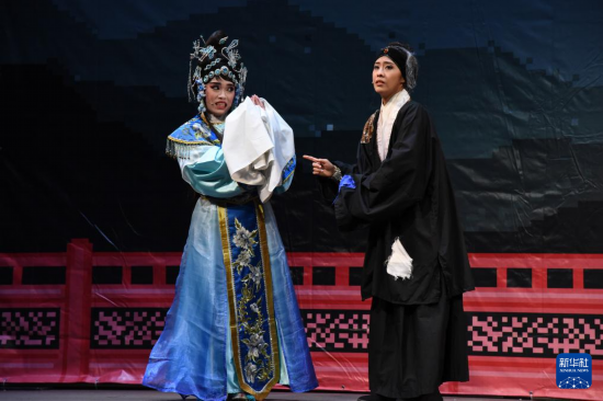 3月5日,台灣戲曲演員在記者會上表演歌仔戲片段。新華社記者 劉斐 攝
